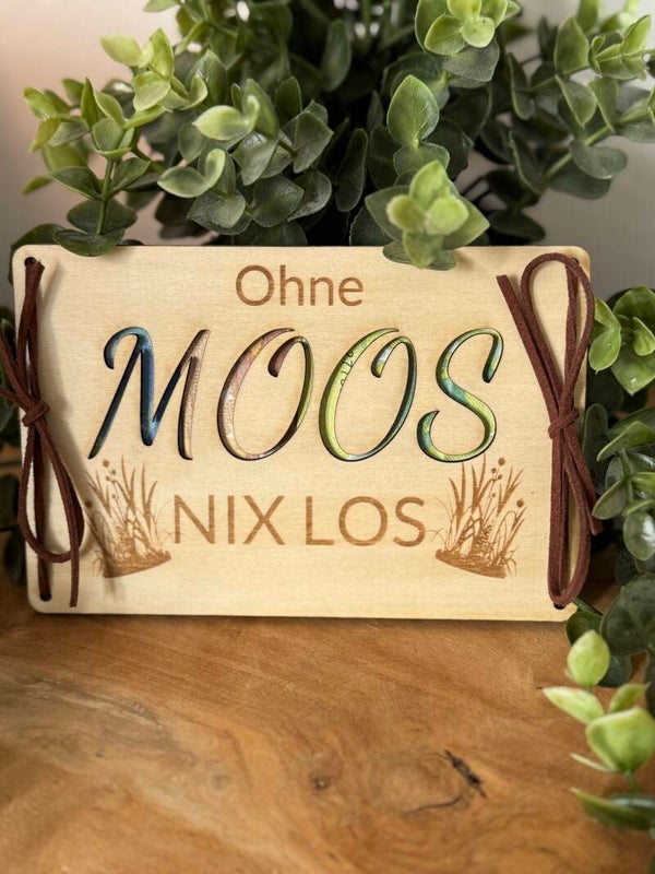 Originelle Holzkarte zum Verschenken von Geld! Die stabile Karte aus hochwertigem Holz wird mit feinen Cutouts graviert und geschnitten. Der Spruch „Ohne Moos nix los“ macht sie zum perfekten Hingucker für Geburtstage, Hochzeiten oder andere Anlässe. Mit Lederband zum Verschließen – ideal, um Geldscheine stilvoll zu verpacken.