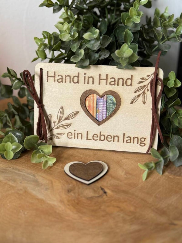 Liebevoll gestaltete Geldgeschenk-Karte aus Holz für einen ganz besonderen Anlass: Mit dem romantischen Spruch „Hand in Hand ein Leben lang“ und einem ausgestanzten Herz, das Platz für einen Geldschein bietet. Ein stilvolles, langlebiges Geschenk zur Hochzeit, Verlobung oder zum Jahrestag.